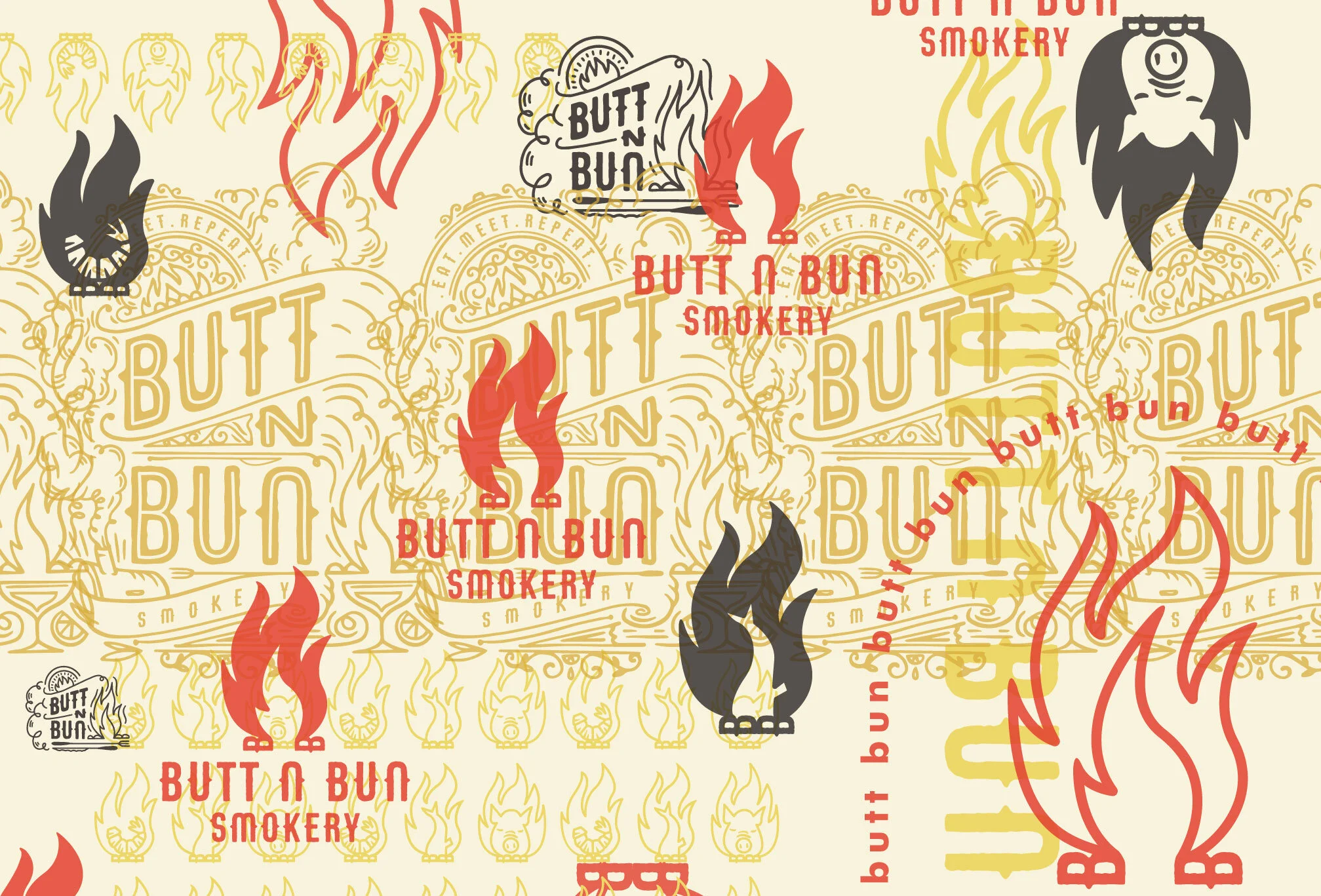 Logo set for Butt N Bun A smokery & clothing company honoring food, drink and neighbors. Go there Where friends meat.
